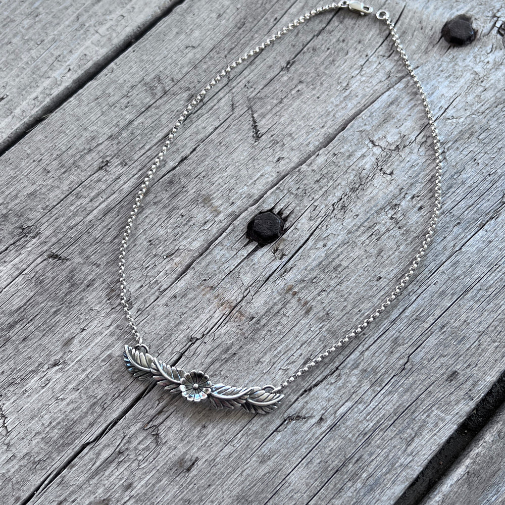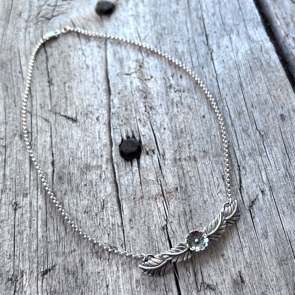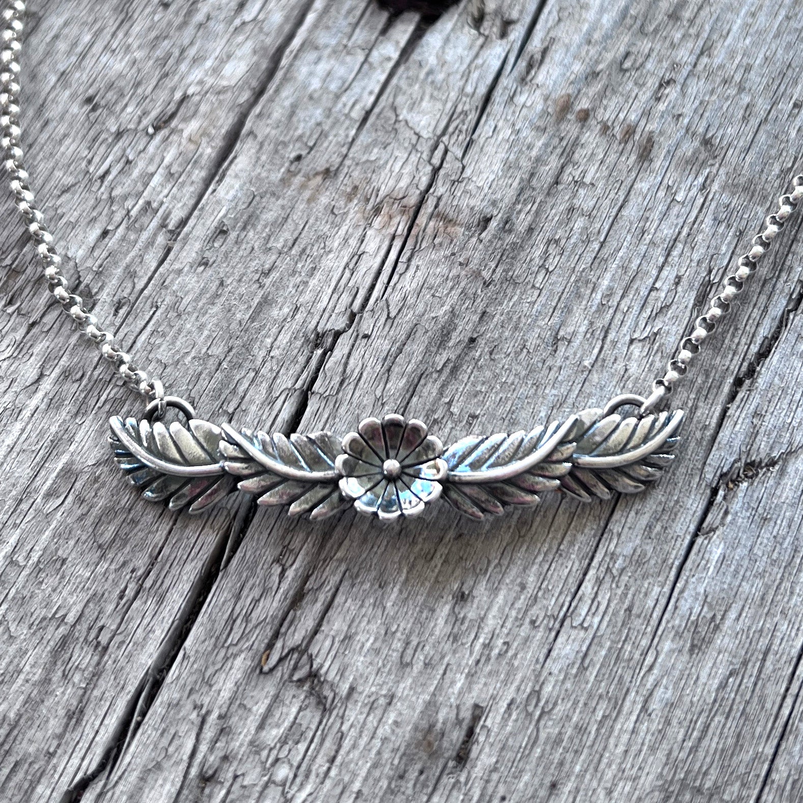 Classic sytle of the southwestern jewelry theme is a silver flower surrounded by feathers. This necklace features the traditional cupped flower found in traditional navajo jewelry and flanked by two layers of feathers.