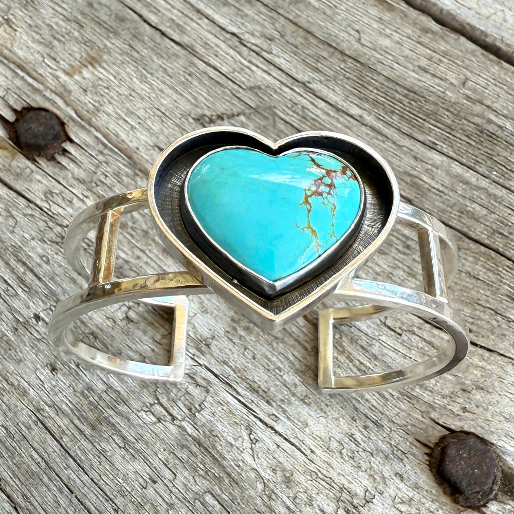 Mined in the United States, Kingman turquoise is considered one of the finest turquoise available. This Sterling silver cuff bracelet features a beautiful specimen of Kingman turquoise in a heart shape.